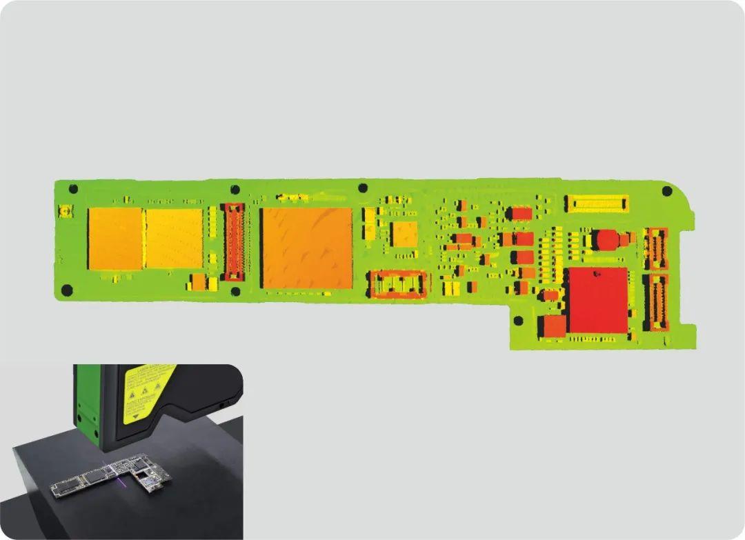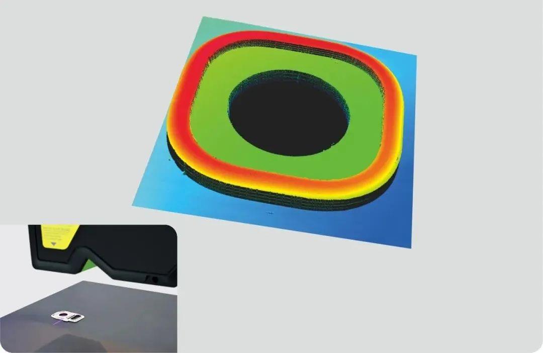 在3C精密零部件检测上,如摄像头支架高度差、平面度检测,使用高精度模式对金属测量,能有效避免反光造成的影响,同时能保证在不同焦距范围内光斑极小扩散,成像质量精细,不遗漏任何外观细节,实时在线快速测量并输出高度差和缺陷变化。