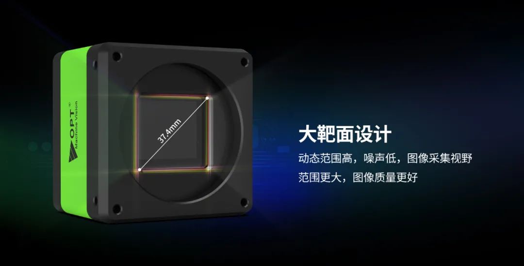 OPT两大系列面阵相机均搭载了高性能图像传感器,最大的靶面对角线尺寸可达37.4mm,具有高感光、高动态、低噪声等特点,采集视野范围大,能捕捉到更多的图像细节,可以获得更好的图像画质,视觉检测精度更高。