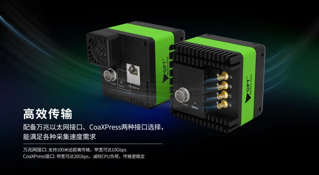 其中OPT万兆网面阵相机,理论支持100米远距离传输和10Gbps带宽,传输更高效,能满足超高帧率的图像采集需求;而且无需搭配图像采集卡,真正实现降本增效。