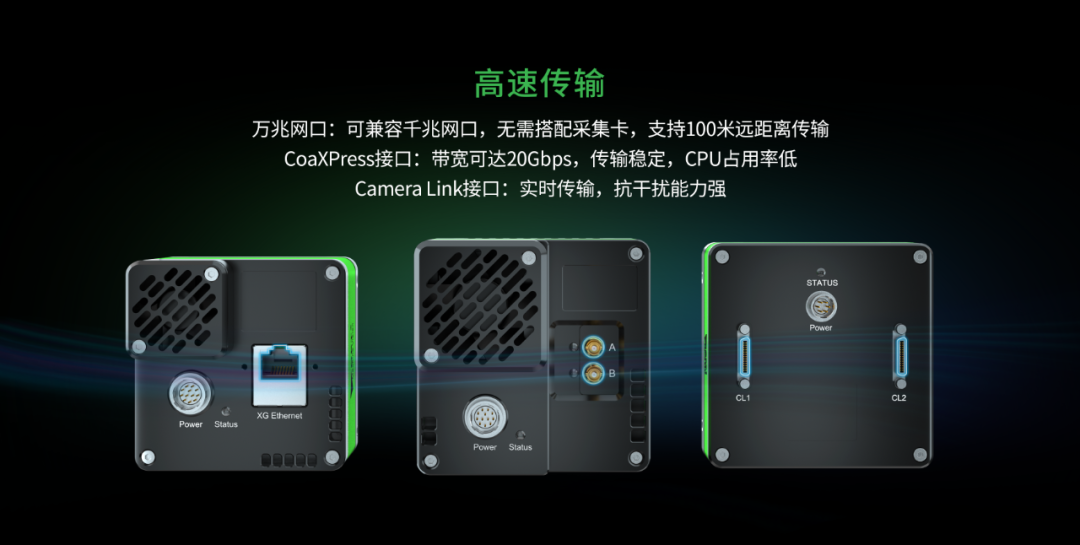其中,万兆网线阵相机,内置大容量图像缓存,无需搭配图像采集卡,理论支持100米远距离无损传输;CXP线阵相机采用的是CoaXPress数据接口,带宽可达20Gbps,传输数据量更大、更稳定;而CL线阵相机采用Camera Link数据传输接口,可实时传输,抗干扰能力强。三大系列线阵相机更贴合高速视觉检测场景的需求。