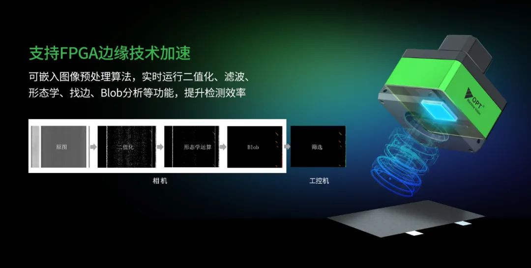 为降低工控机运行及软件算法处理分析图像负荷,OPT在万兆网线阵相机植入FPGA边缘计算技术,充分利用相机内部并行运算能力,实时对采集的图像进行二值化、滤波、形态学、找边、Blob分析等,即相机在采集时就已同步对图像进行预处理和分析。