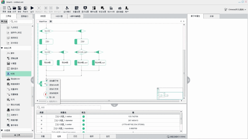 在部署流程图过程中,Smart3视觉软件支持拖放功能,可对Goto、线程、分支等模块化编程,进行灵活拖拽部署,满足不同应用场景的流程设计需求,为客户提供更简单、更灵活的视觉搭建方式。