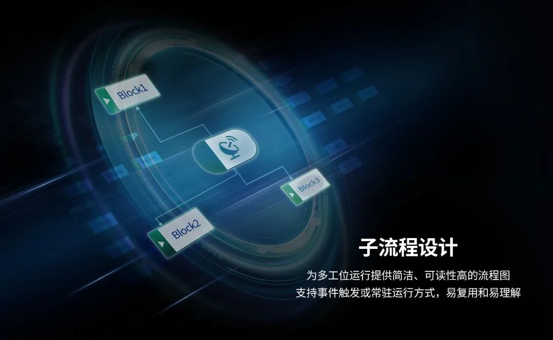 针对多工位的视觉检测应用,Smart3还可通过新增子流程,将多个视觉算法和节点进行模块化管理,实现更简洁、可读性更高的流程图设计;同时将事件触发与图形化编程进行创新组合,使子流程支持同步和异步执行,甚至支持独立于主流程的运行方式。