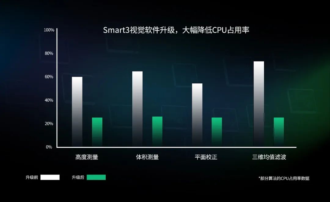 OPT Smart3视觉软件通过优化底层代码,大幅降低CPU占用率,使图像分析流程更高效。如高度测量、平面校正、三维均值滤波等算法,相比于升级前,其占用率降低近一半。