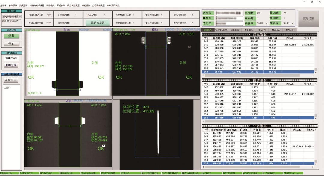 激光分切工序采用激光切割出极片极耳,生产过程中实时在线检测缺陷(漏金属、破损、余料、mark孔、接带、气泡、脱碳、白点等)、尺寸(极片长度、极片宽度、极耳高度、分切宽度等)。根据分切尺寸、极耳高度等进行纠偏闭环,并对不良极片打标。